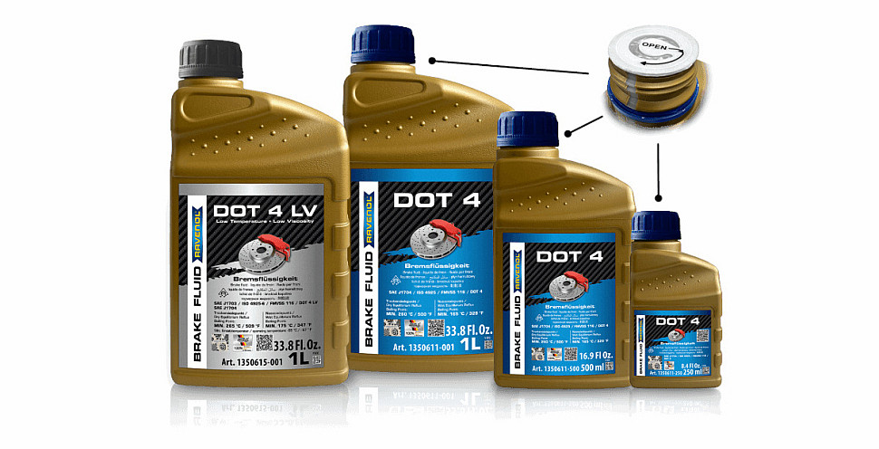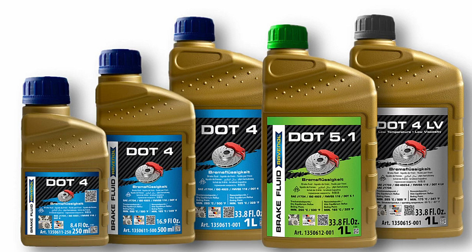 Для простого и быстрого определения типа тормозной жидкости, крышки и этикетки на канистрах выполнены в определенных цветах: DOT 4 — синий, DOT 5.1 — зеленый, DOT 4 LV — серый.