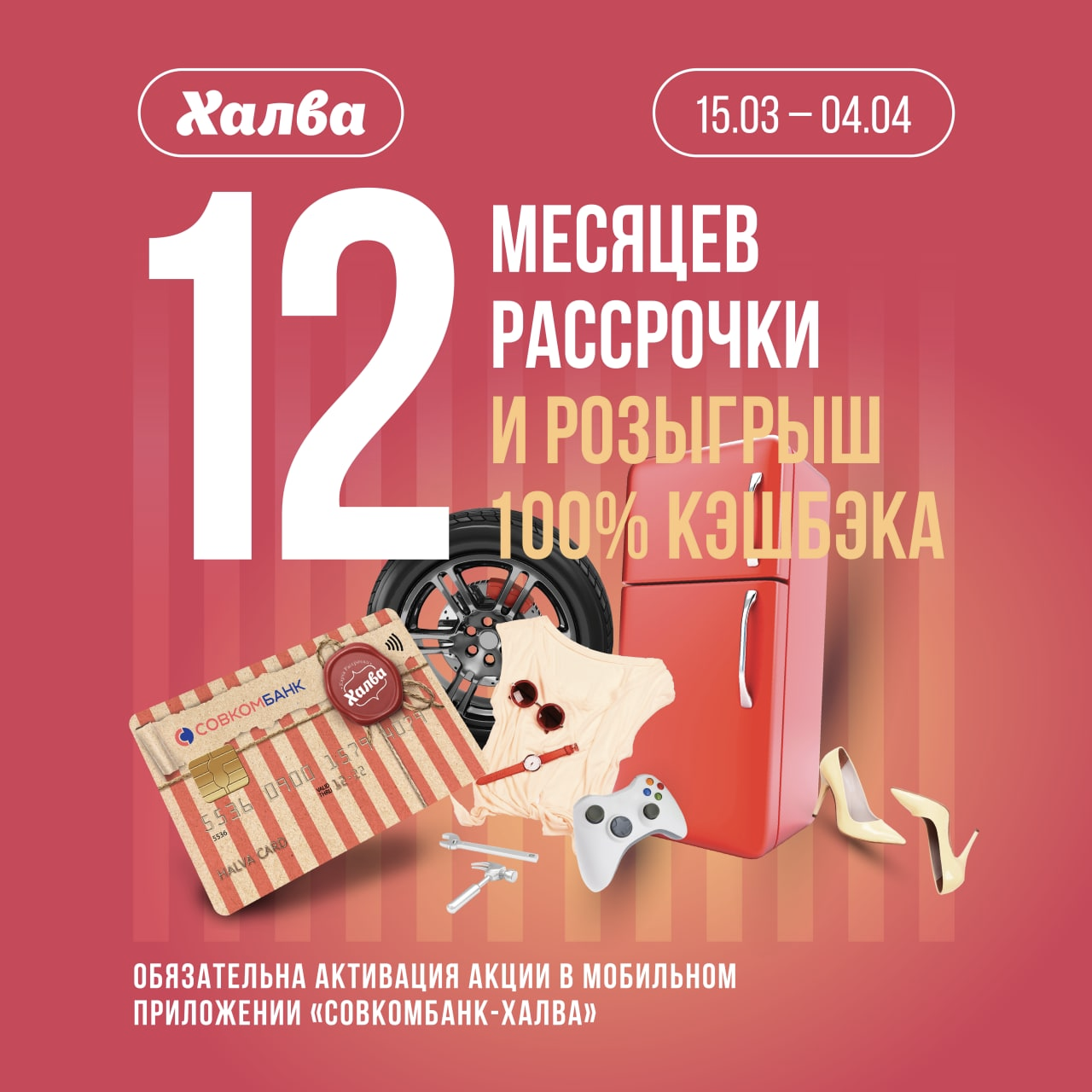 До 4 апреля активируйте акцию «Недели Умных Рассрочек» в мобильном приложении «Халва-Совкомбанк» — участвуйте в розыгрыше 100% кэшбэка и гарантированно получите 12 МЕСЯЦЕВ рассрочки по Халве на покупки у партнёров акции. Каждую неделю добавляем новых партнёров акции, полный список смотрите в разделе «Партнёры».
